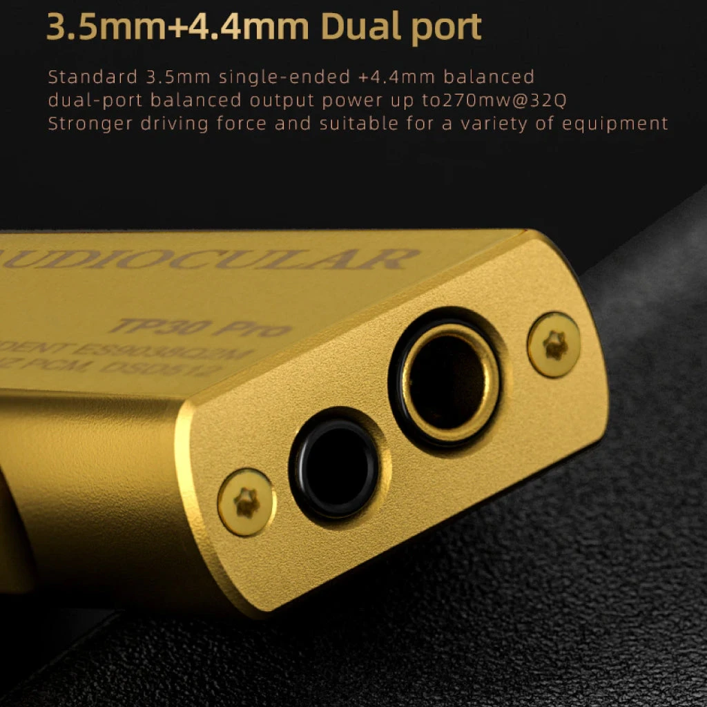 AUDIOCULAR TP30 Pro features dual headphone output ports, including a single-ended 3.5mm and a balanced 4.4mm headphone output. This versatile configuration ensures compatibility with a wide range of in-ear monitors (IEMs) available in the market. TP30 Pro offers excellent output thrust, making it capable of effortlessly driving even the most demanding IEMs.