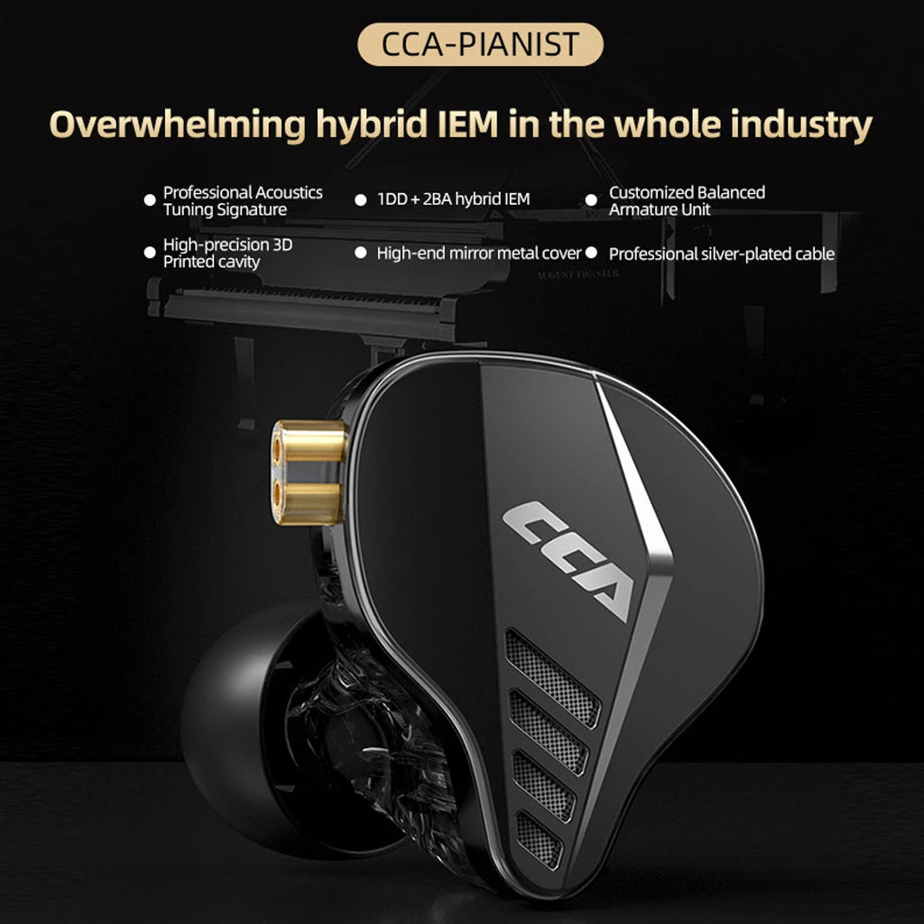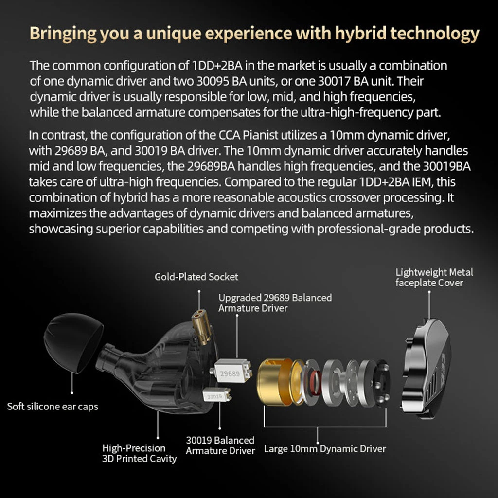 The CCA Pianist in-ear monitor is equipped with 3 driver hybrid configuration, housing a 10mm dynamic driver, 29689 balanced armature, and 30019 balanced armature driver units. The drivers are arranged in a 3-way frequency crossover with the dynamic driver, providing an impactful lower end, the 29689 BA driver delivering ultimate midrange clarity, and crispy treble and the 30019 BA driver producing nicely extended ultra-high frequency response. Overall, it brings together a clear, crisp sound which complements different genres of music well.