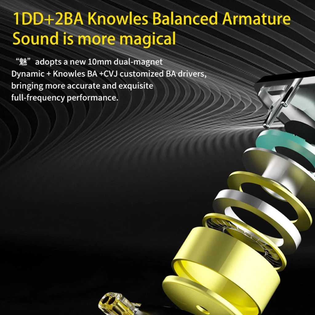 CVJ Mei is equipped with hybrid driver configuration specially designed with dual magnetic driver unit and dual balanced armature driver. CVJ features a Knowles BA unit and a customized BA driver unit on the set. The DD unit here is tuned for a full-frequency response.