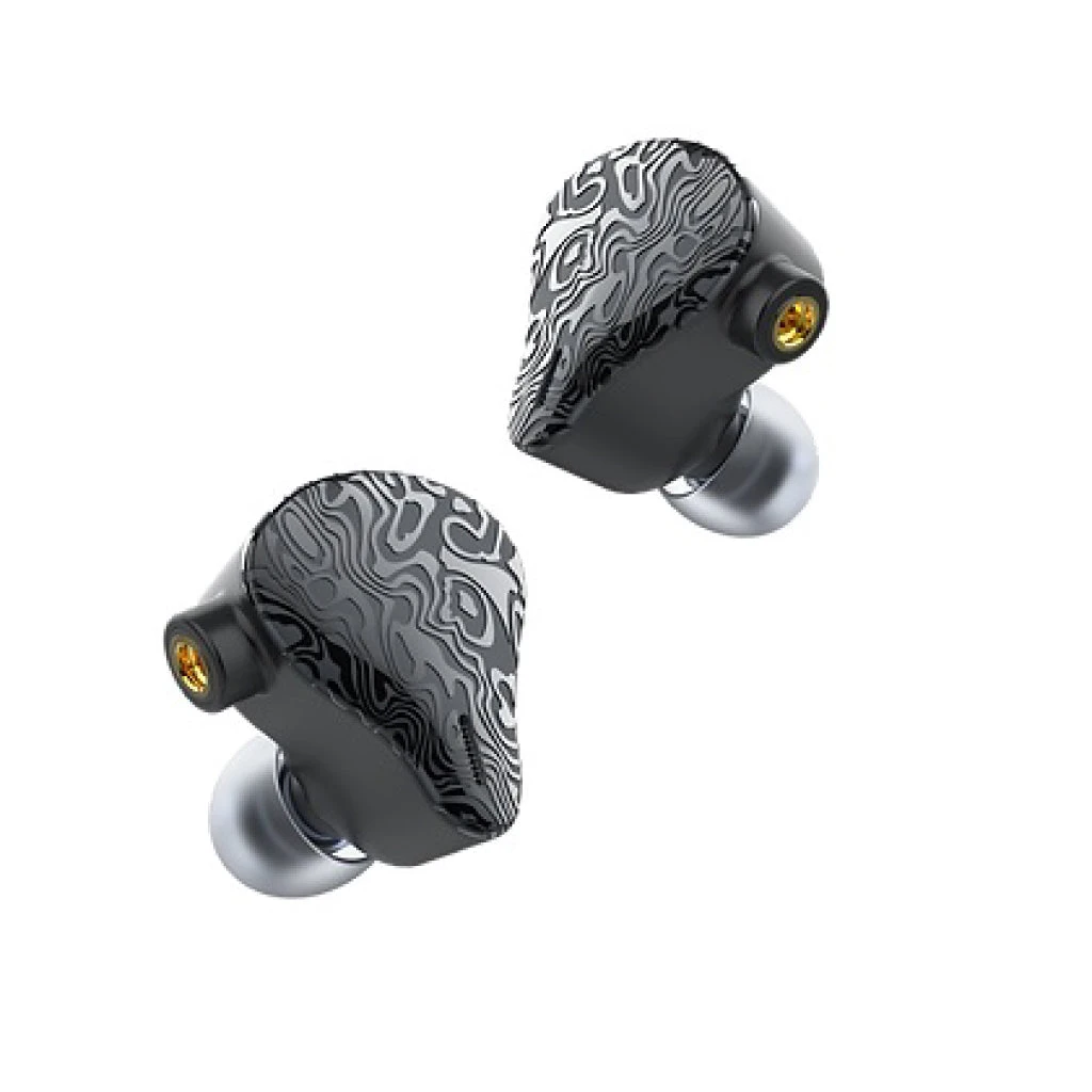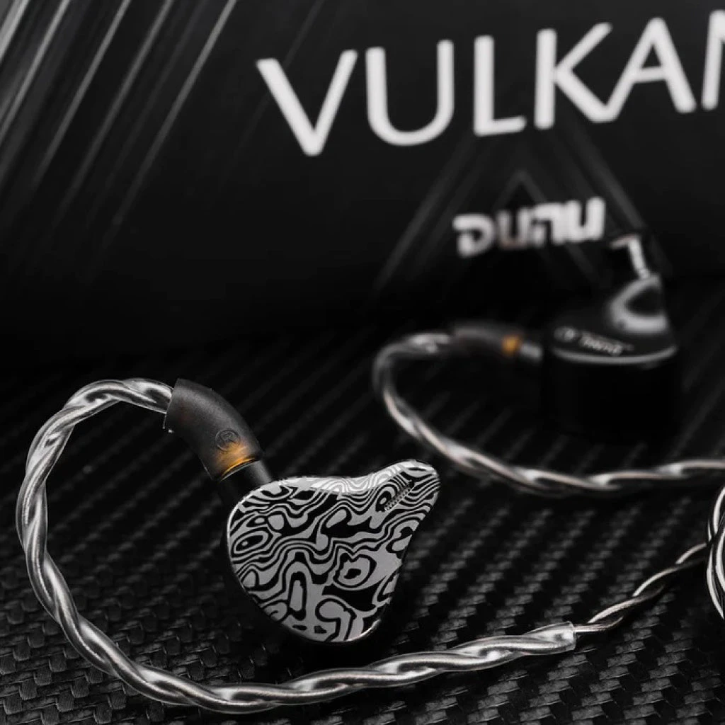 It has ergonomically shaped 3D printed aluminum alloy ear shells and Mokume Gane-inspired designer face covers. A unique and exquisite look is provided by the ergonomic shape of the DUNU Vulkan.
