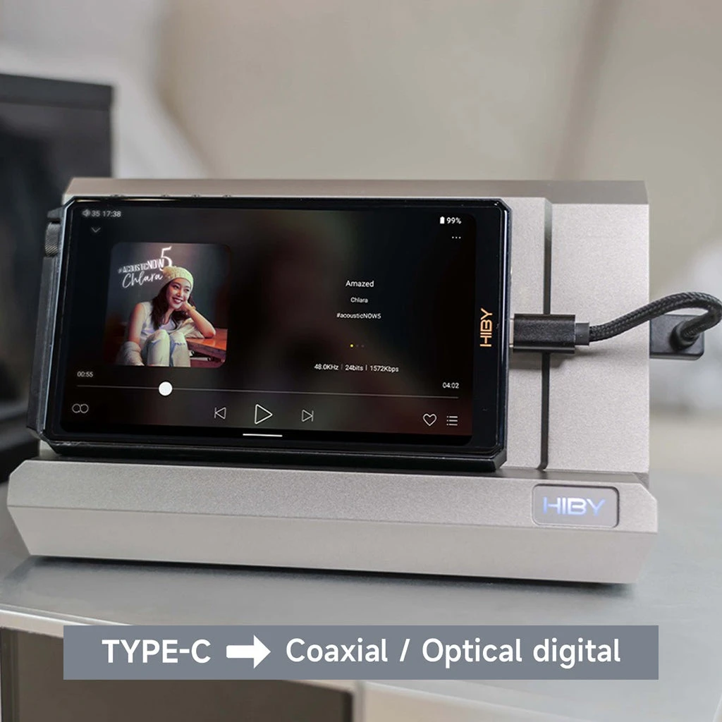 The HiBy CR06 is equipped with Coaxial/Optical Digital outputs and RCA/XLR Analog outputs, allowing you to leverage its capabilities. By utilizing this device, you can effortlessly navigate through your music library, stream additional content, and even connect a portable hard drive to your compatible digital audio player. This setup enables you to seamlessly integrate your player into your desktop chain, effectively using it as a digital media source.
