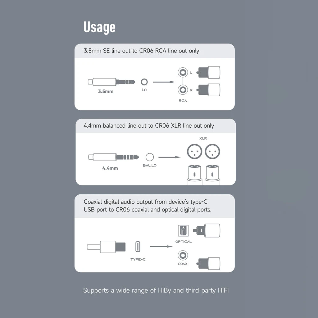 HiBy has implemented a clear and straightforward audio circuitry design in the CR06, ensuring that each input is associated with its respective output. This intelligent configuration eliminates any confusion and provides you with the flexibility to choose how you want to utilize the CR06. For instance, the 3.5mm aux input enables RCA output, the 4.4mm line input facilitates XLR balanced output, and the USB input grants you Coaxial and Optical digital outputs. HiBy ensures a clean and seamless system operation, allowing you to enjoy a flawless audio experience.