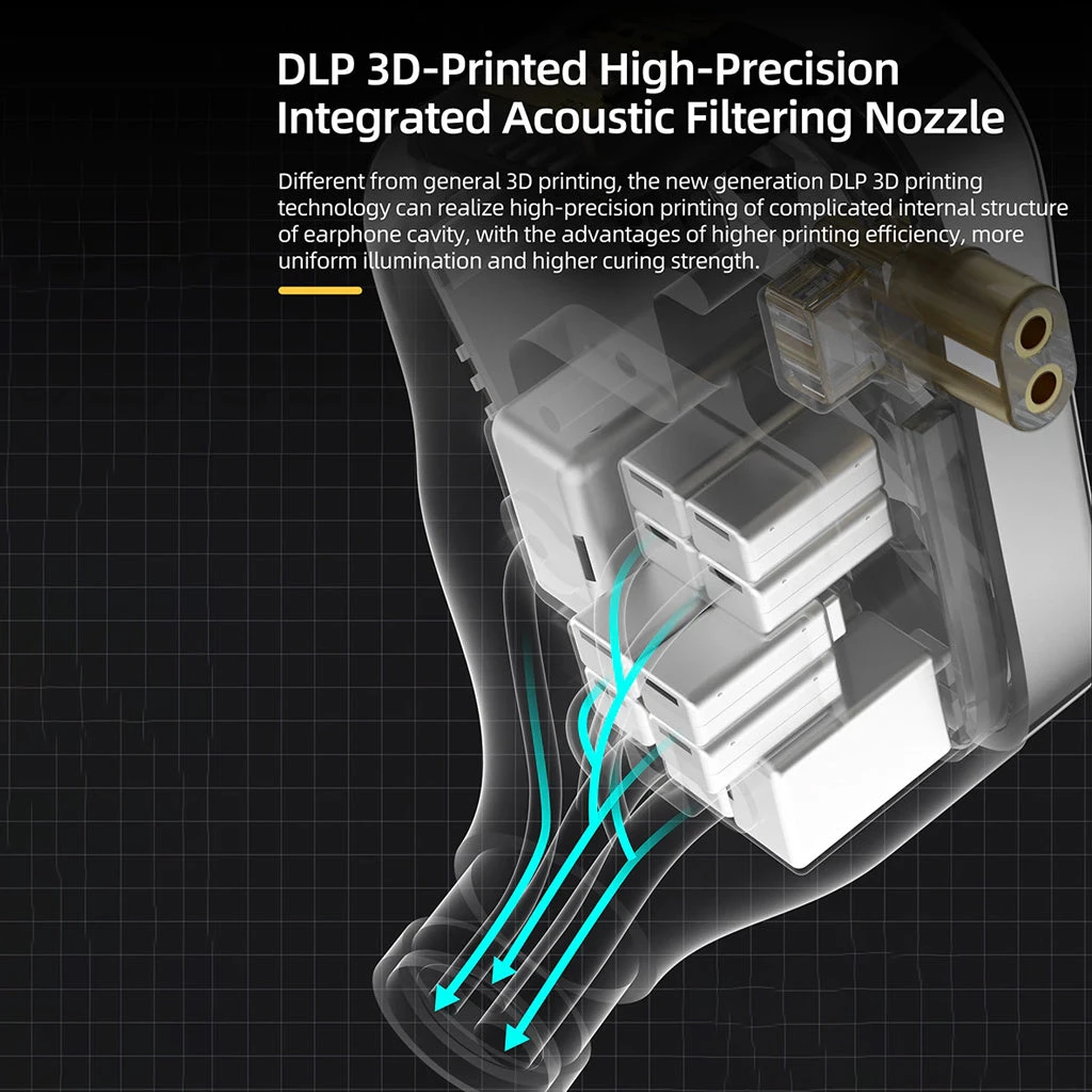 The AS24 In-ear monitor features a DLP 3D printing technology to create a high-precision integrated acoustic filtering nozzle. This advanced manufacturing technique allows for the accurate and intricate printing of complex internal structures within the earphone cavity. As a result, the AS24 achieves efficient and uniform sound reproduction, enhancing the overall audio quality and providing a more immersive listening experience.