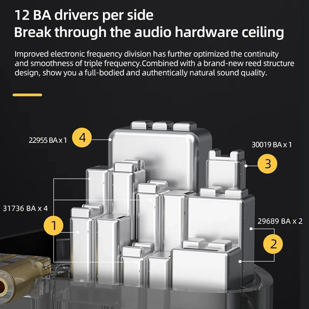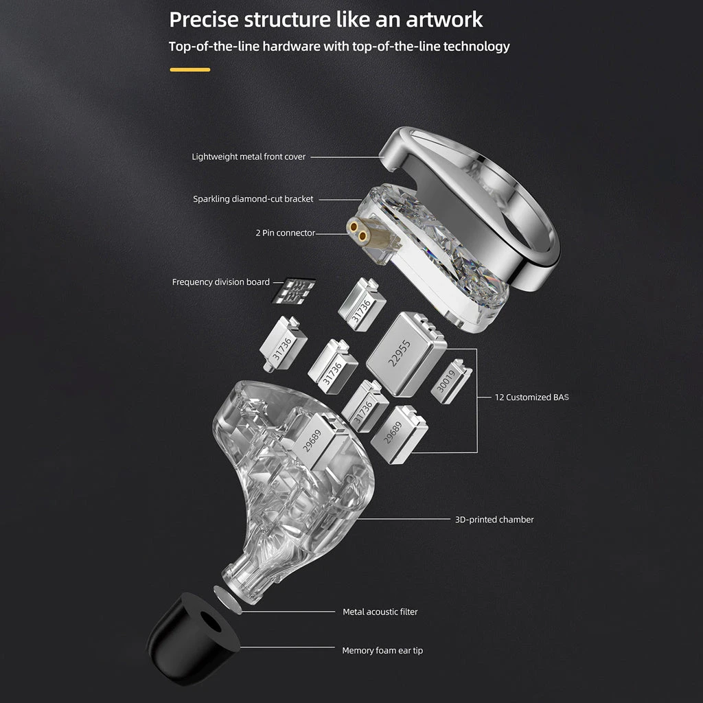 12 BA Drivers Per Side | BA Drivers Optimized for Each Frequency Range | Precision DLP 3D-Printed Acoustic Nozzle | Classic Ergonomic Design for Comfort | Improved Cable-Removable Design | High-Purity Silver-Plated Flat Cable | 3.5mm Gold-Plated Connector for Optimal Signal Transmission | Streamlined One-Button Line Control | Includes 3 Pairs of Silicone Ear Tips | Environment-Friendly Packaging