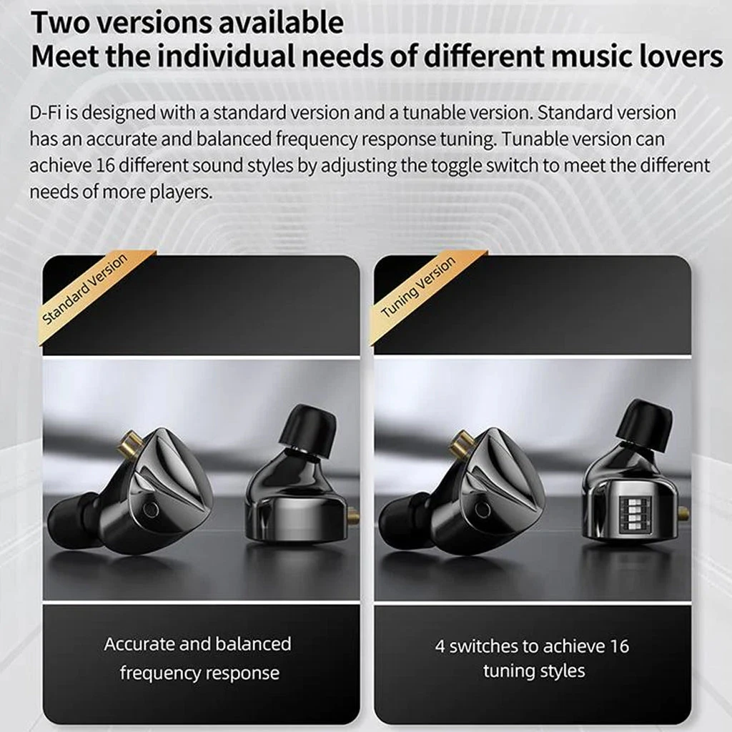 KZ D-Fi earphones come in two versions: a standard version and a tunable version. The standard version features an accurate and balanced frequency response tuning, while the tunable version offers 16 different sound styles so, users can easily switch between different sound styles to find the perfect audio profile for their individual preferences and listening needs that can be adjusted using a toggle switch. This allows for a more customizable listening experience that can meet the needs of a variety of different users, including musicians and audiophiles who demand high-quality sound.