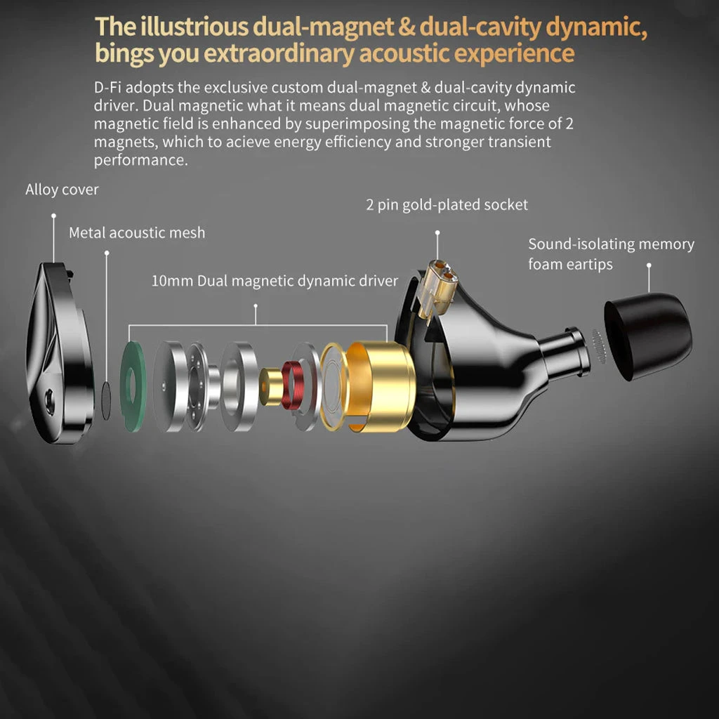 The KZ D-Fi earphones feature a unique custom dual-magnet and dual-cavity dynamic driver, which is designed to provide an exceptional audio experience. The dual-magnet design refers to the use of two magnets in a circuit to enhance the magnetic field, resulting in improved energy efficiency and transient performance. This Pair delivers high-quality audio for music enthusiasts and audiophiles.