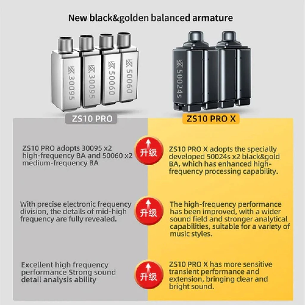 : ZS10 Pro X features upgraded black & gold balanced armature drivers. They bring an all-round upgrade in the sound performance with improved resolution and clarity. The new BA drivers are specially developed for enhanced high-frequency response.