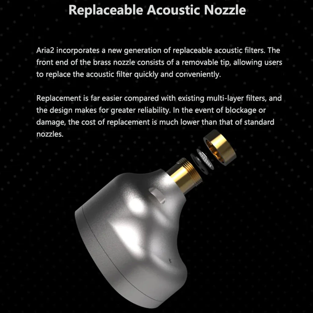 Moondrop’s Aria 2 comes with top-notch brass nozzles that are precisely crafted and feature a gold-plated surface for a premium look. These nozzles have a smart design that allows you to replace the filters easily. If you ever need to change the filters, just unscrew the nozzle and put in new ones.