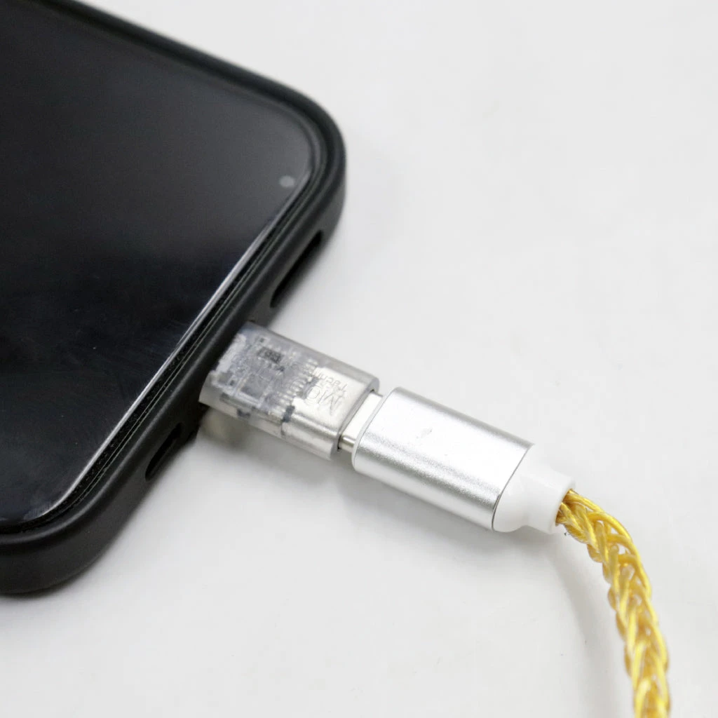 The USB Type-C to Lightning Adapter by Moondrop has a super compact build. The outer shell is transparent showcasing the entire circuitry inside. It plugs into your Apple devices and you won’t even notice it for its compact form factor.