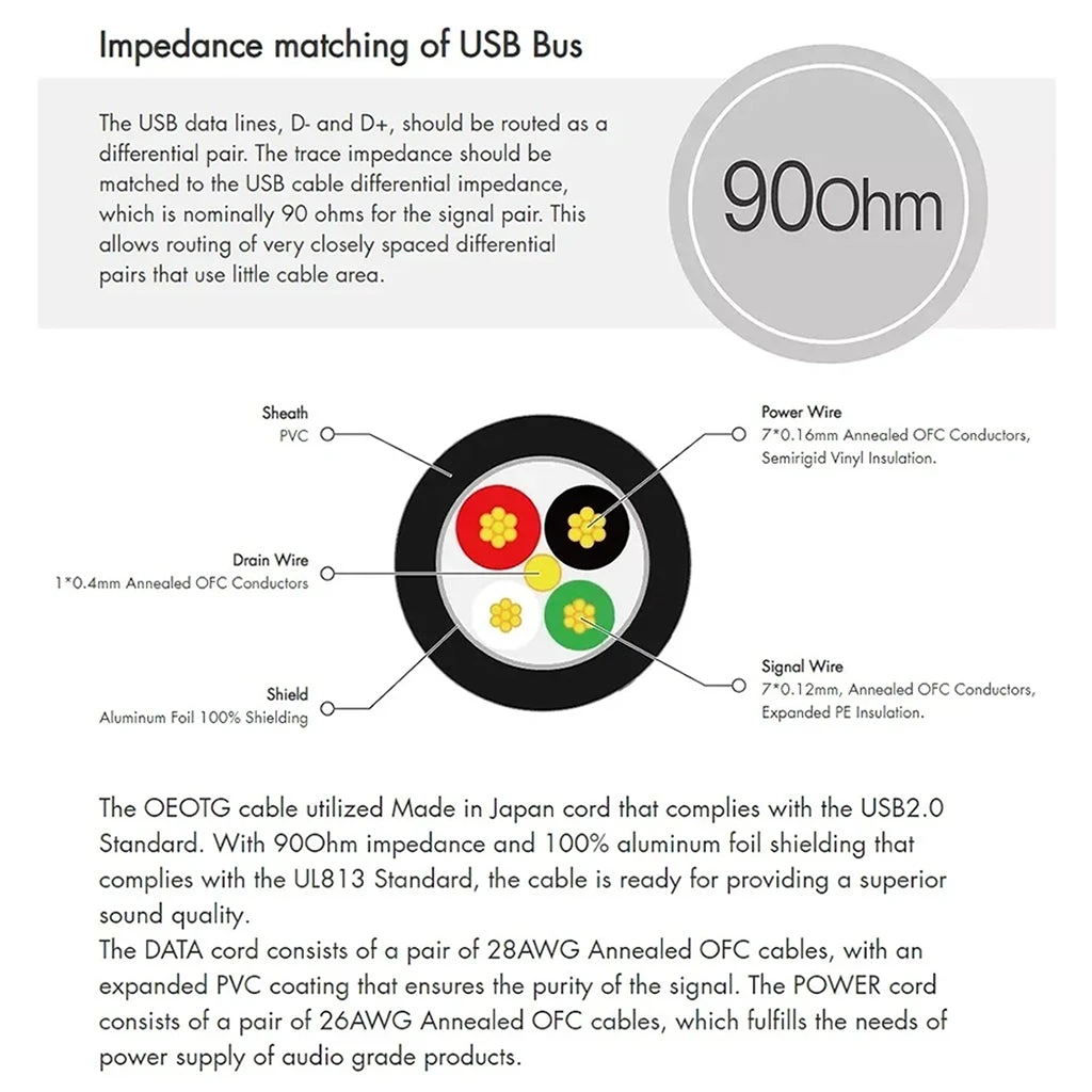 This audio cable uses a cord that is made in Japan and follows the USB 2.0 standard. It has a 90-ohm impedance and is fully shielded with aluminum foil, meeting the UL813 Standard. This ensures that it doesn’t just meet the requirements but performs exceptionally well