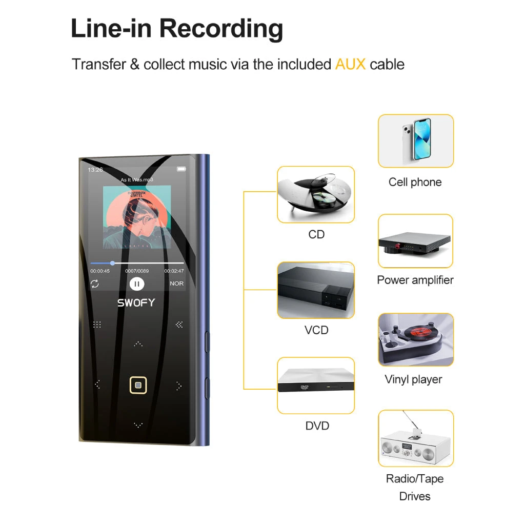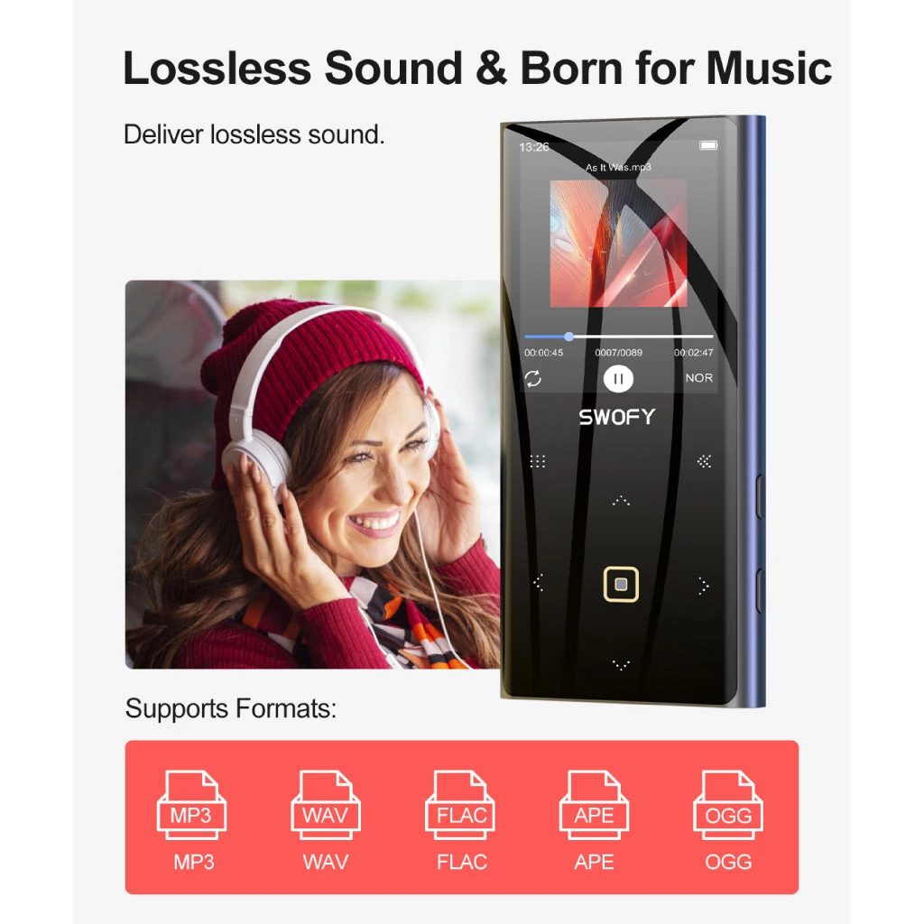 M2 Mp3 player comes with a Bluetooth 5.0 chip, which can be compatible with other versions of Bluetooth devices, such as headphones, speakers, car stereos, and provides fast pairing and stable connections. With intelligent noise reduction chip, it effectively reduces noise and providing clear sound. The following audio formats are supported: APE, WAV, FLAC, MP3, OGG.