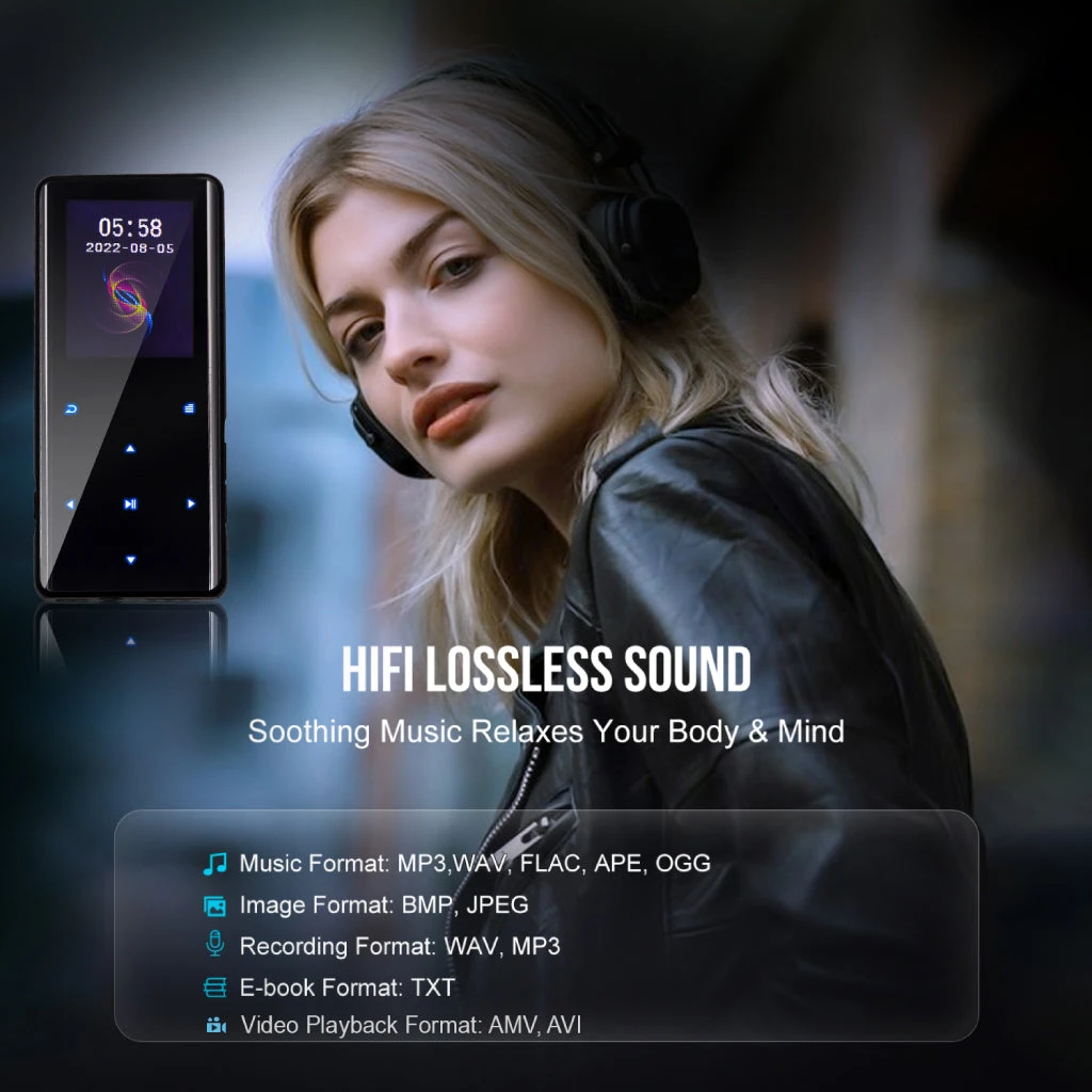 SWOFY T-MP30 Mp3 player comes with a Bluetooth 5.0 chip, which can be compatible with other versions of Bluetooth devices, such as headphones, speakers, car stereos, and provides fast pairing and stable connections. With intelligent noise reduction chip, it effectively reduces noise and providing clear sound. The following audio formats are supported: APE, WAV, FLAC, MP3, WMA.