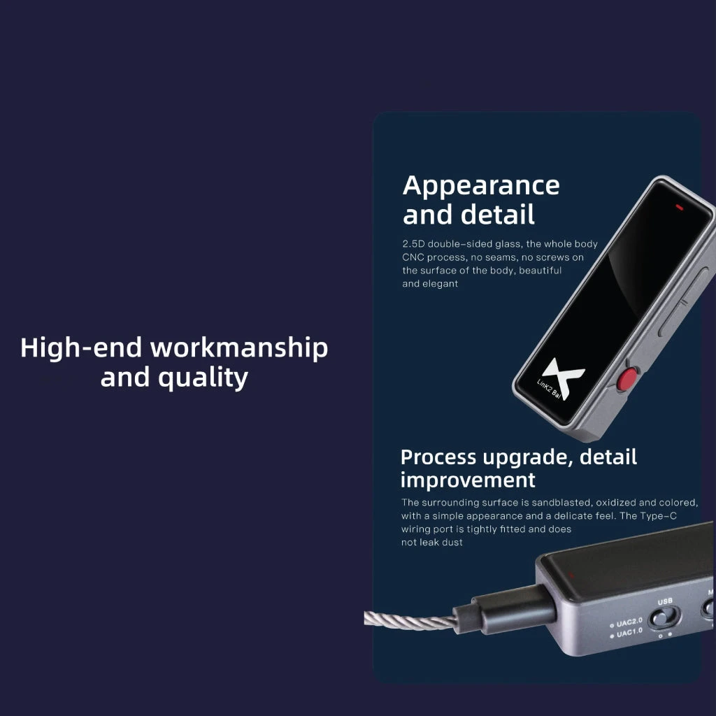 LINK2 BAL adopts 2.5D double-sided glass, with the whole-body CNC Process, there is no seems and screws on the surface of the body, beautiful and elegant. The surrounding surface of the body is sandblasted, oxidized and colored, with a simple appearance and a delicate feel. The Type-c wiring port is tightly fitted and keep the connection away from leak dust.