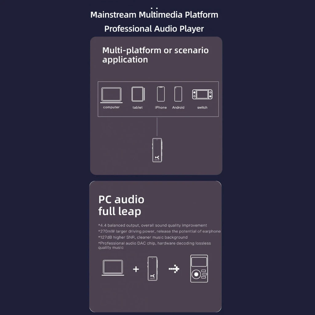 Ordinary mobile phones can only decode 16bit/48khz audio while LINK2 BAL supports up to PCM32bit/384Khz and native DSD256, maximize the potential your dynamic driver headphones. It will be more brilliant with high-quality headphones. Link2 Bal has 4.4 balanced output and 3.5 unbalanced output, no need for adapters even if you have a variety of headphones.